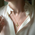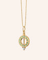 18K Yellow Gold and Celadon Green Enamel. Diamond Carat Weight: 0.13cts; FG-VS2. Charm Measures: 7/8" Tall, 9/16" Wide. Chain Options: No Chain, 17" Yellow Gold Delicate Diamond Cut Chain with loop at 16" for adjustability or with an 18" Yellow Gold Ball Chain with loop at 16" for adjustability.. Charm made in Thailand. Chain made in Germany.