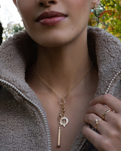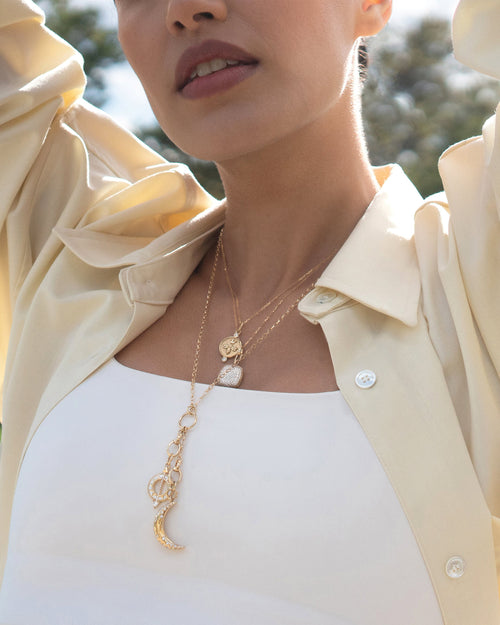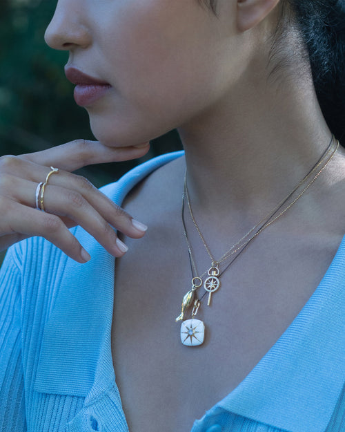 Creating a diamond charm bracelet can start with the chain. Many of our charm bracelet chains like the Marilyn or Rosalind bracelet are available with pave’ diamond links. These links can be customized to your choice, creating the diamond charm bracelet that will be uniquely yours. The right choice of diamond charm can also allow you to create a special diamond charm necklace. Those gold charms with diamonds will become empowering pieces in your everyday style. Our sterling silver charms, charm necklaces and charm bracelets offer similar opportunities to create the ultimate personalization pieces, but are offered with white sapphires to give you the type of sparkle you might look for in our gold diamond charms. All of our gold charms and diamond charms can also be paired with our Design Your Own collection of chains. The chains are available in 18K gold, sterling silver, black steel and pearl strands. These allow you to create versatile layering looks, both long and short, that you can combine with your favorite jewelry pieces from your jewelry box. If you would like to create, mix, change and rotate these necklaces you can create from our charms, please visit our new Design Your Own Experience page. If we can help you with the right choices of charms, diamond charms, charm necklaces or bracelets, please contact our stylists at concierge@monicarichkosann.com. They are available to help you find just the right pieces to capture your uniquely personal story.