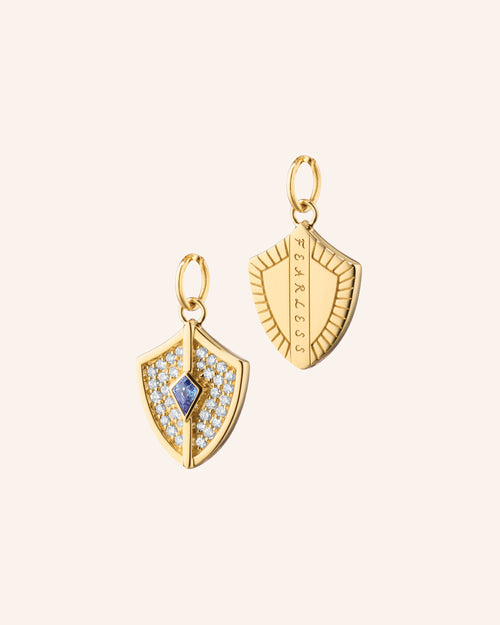 Mini "Fearless" Shield Necklace with Diamonds and Blue Sapphire