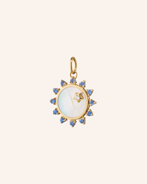 Mini "Happiness" Sun Necklace with Mother of Peal, Sapphires, and Diamonds