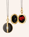 Material: 18K Yellow Gold over Sterling Silver and Black Enamel. Locket Measures: 3/4” in Diameter. Chain Length: 17" Black Steel (loop at 16"). White Sapphire Carat Weight: 0.15cts. Locket Made in Thailand. Steel Chain made in Germany.
