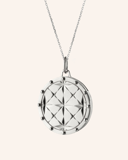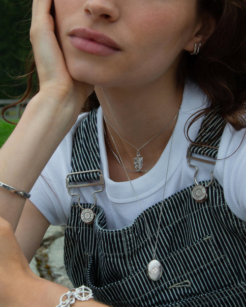 The lockets can then be combined with other chains in one’s jewelry box to allow for a customized charm locket necklace, allowing for the versatility associated with other charms and pendants. With this in mind, we created a collection of locket charms that incorporate a variety of stones and design motifs. In 18k gold, many of the styles are accented with diamonds, while in sterling silver we use white sapphires to give just the right amount of sparkle. The charms can be paired with our necklace chains, our design your own chains, or our design your own charm bracelets. Any of those combinations allow for a personalized take on how to let the locket charm tell your story. Our heart locket charm is an iconic shape within the collection and for those who are looking to tell the most stories possible, our four-image locket charm becomes a memory locket charm of sorts. Also, unique in the collection are our half lockets. We took half the locket and engineered it so it can easily be worn with the picture positioned privately against the skin when paired with a short necklace chain. Once you’ve created your charm locket necklace, consider pairing it with our other charm necklaces such as our cross charms, dream charms or any the other options from our broad collection.  For further help finding the perfect locket charm, please contact one of our Monica Rich Kosann stylists at concierge@monicarichkosann.com.