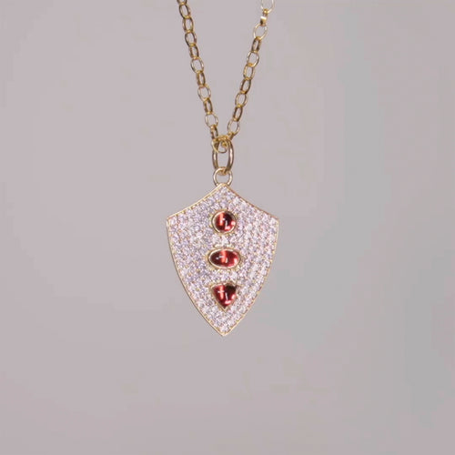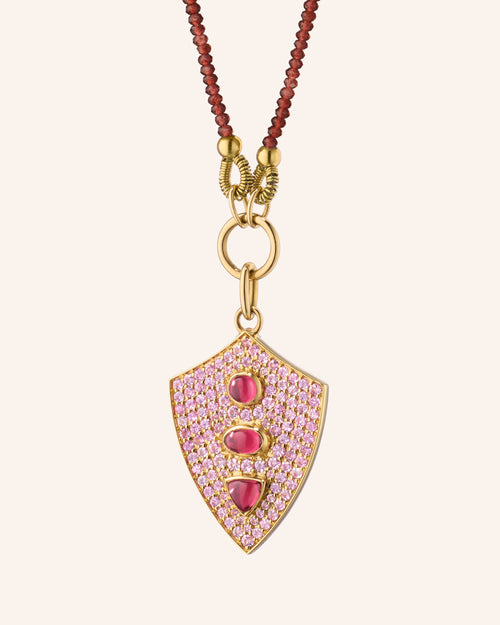 "Fearless" Shield Necklace with Pink Sapphires and Rhodolite
