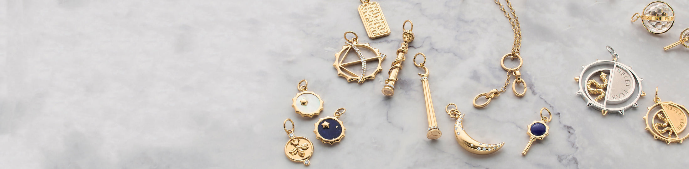 A locket is the defining personalized necklace, as each one holds a secret known only to the woman who wears it. When we introduced our Design Your Own Necklace Collections it created a new generation of personalized necklaces that women could literally change out every day with our charms, or those she already owned, to allow for the expression of her ongoing life journeys. The idea of using charms to create a unique story was also an early pillar of our brand as our charm bracelet collections were introduced in our earliest years. These personalized bracelets came with chains where charms could be permanently attached, or easily added and removed, depending on the chain styles. The resulting personalized charm bracelet was a “storybook”, as Monica always called it, with a lovely “jangle” that could be heard every time the woman wearing it moved her wrist. In the world of personalized rings, our Poesy Ring Collection offers so many choices. Poesy Rings are a 500 year old idea where rings were engraved with inscriptions of love, and friendship. Our Poesy Rings are offered with empowering inscriptions that can be mixed and matched across fingers and hands, or added to a chain and worn as a necklace. All of our personalized jewelry collections are available in 18k gold and sterling silver, so if one wants to create a personalized gold necklace for example, there are so many options to choose from. If you need assistance in creating your personalized jewelry style, please contact us by phone, chat or email at concierge@monicarichkosann.com.