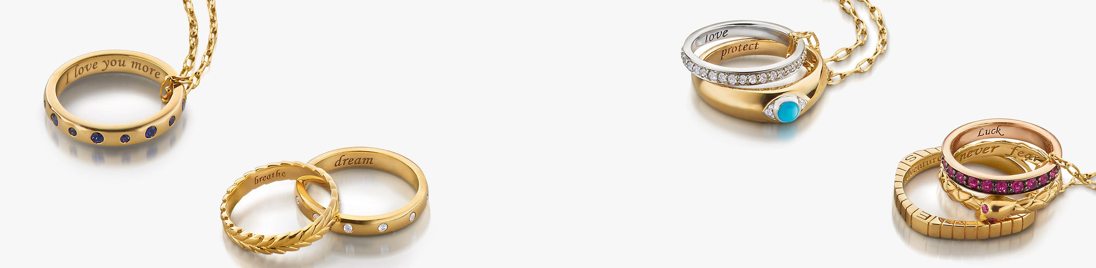 What is a Poesy Ring Necklace and how did we create this collection? %expanded-mobile% The idea first started for us around Poesy Rings themselves, when Monica discovered them in while rummaging through a flea market in the United Kingdom a number of years ago. Poesy Rings were rings that bore inscriptions of love, friendship or endearment and dated back to the 1400’s. Those inscriptions were known as “Poesys”. We found the idea of the Poesy Ring so inspiring that we just had to make them new and modern again. %expanded-desktop% Monica had also always loved how women would often wear their family heirloom rings on a necklace chain, creating their own unique personalized jewelry. And it was with that idea in mind that the Poesy Necklace was born. Just like many of those hundred-year-old styles, we created a collection of sterling silver poesy rings, starting at $60, that – like all our Poesy Rings – had inscriptions inside of empowerment, love, sisterhood or friendship. This collection of silver poesy rings was combined with an extensive collection of 18K gold Poesy Rings, to create the complete collection of Monica Rich Kosann Poesy Rings. The collection allows you to choose the Poesy Rings that express something about you, or the person you are selecting them for as a gift; and add those rings to a sterling silver, 18k gold or even black steel chain, allowing you to create the perfect necklace. It is with that in mind that we want you to be able to find The Perfect Poesy. It is the ultimate in personalization, and incredibly thoughtful as a gift for that special person. The excitement generated by our introduction of the Poesy Ring Collection let us to create a collection of Poesy Bracelets as well. They are bracelets that can be worn all the time – yes, we never take them off – and the empowering inscriptions are secretly hidden on the underside to quietly empower you each day.