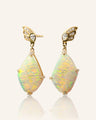 A pair of carved Crystal Opals with a soft and happy play of color, Monica reimagined these into deconstructed Butterfly Wing Earrings. These 18K Yellow Gold Earrings feature Australian Crystal Opals and Diamond accents on the front and the patterning of the wings on the back, these earrings are beautiful from all angles.