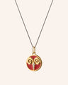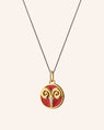 Material: 18K Yellow Gold over Sterling Silver and Red Enamel. Charm measures 1/2" in Diameter. White Sapphire Carat Weight: 0.042 cts. Chain: No Chain or 17” Black Steel Chain (loop 16"). Charm Made in Thailand. Steel Chain made in Germany.