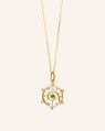 18K Yellow Gold. Diamond Carat Weight: 0.14 cts., Emerald Carat Weight: 0.05cts.; FG-VS2. Charm Measures: 3/5” in diameter. Chain Options: No Chain or 17" Yellow Gold Chain (loop at 16”). Charm made in Thailand. Chain made in Germany.
