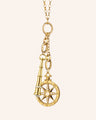 Made in Thailand. 18k Yellow Gold Chain Length: 22". "Adventure" Compass Charm measures 1" in Diameter; Materials: 18k Yellow Gold, White Diamonds, and Moonstone. "Curiosity" Telescope Charm measures 1.65" Tall, .3" Wide; Materials: Sterling Silver, White Sapphires and Rock Crystal. Total Diamond Carat Weight: .446cts, FG/VS2 Quality.