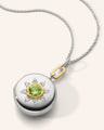 This Sterling Silver Special Edition Round Locket features an 18K Yellow Gold Bezel set Green Tourmaline stone with white sapphire accents and an 18K Gold bail. This locket is presented on an 18" Silver Chain (loops at 17” and 16”) and holds 2 photos. Fill your locket with The Locket Bar® .